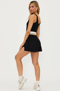 Our best-selling Remi dress in our ultra-soft ribbed fabric is the ultimate active dress, perfect to take you from courtside to bayside. Featuring a supportive shelf bra and fitted shorts with side pockets underneath. Now in our Sandshell Colorblock which is sleek black with white and tan colorblocking on the waistband.